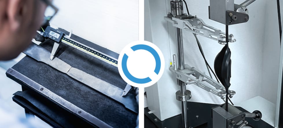 Measurement is carried out using a dynometer, a traction device with an extensometer that follows two marks on the sample. It can measure, at any time, the size of the rubber test sample when it’s being elongated and at breaking point. Elongation is expressed as a percentage: elongation percent = (elongation at rupture) x 100/(initial gauge length).